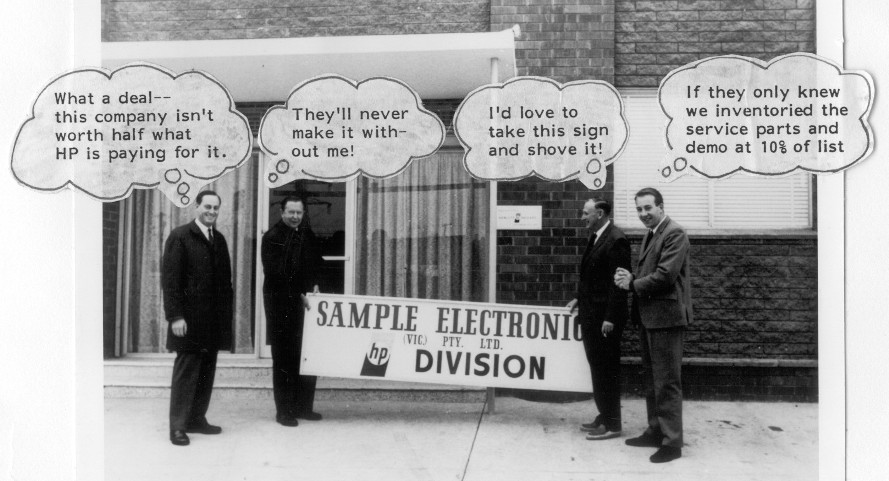From its inception, Hewlett-Packard used independent manufacturer’s representative sales organizations to sell its products in the USA. HP did not have a dedicated sales force. Internationally, HP used distributors to sell its instruments. Beginning in 1962, HP began developing its own dedicated sales force in the USA (primarily through the purchase of existing manufacturer's representative companies) and started setting up company-owned offices overseas. In most cases, HP bought the HP distribution business (including employees and offices) from the local country distributor. That is what happened in Australia in 1967.